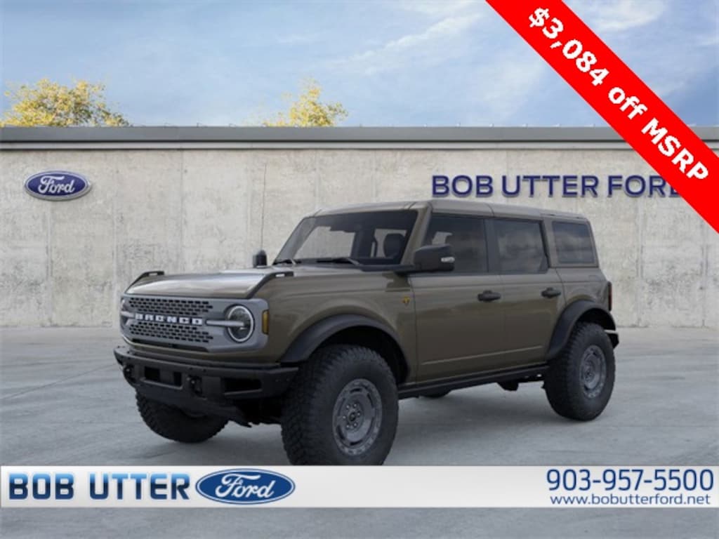 ''Here at Bob Utter Ford, we want you to feel like you are a part of our family. Our Internet Sales Team makes purchasing a vehicle quick and easy! Let us help you with your new Ford today! You can view all of our inventory at www.bobutterford.com. Contact the Internet Sales Dept. at 903-957-5500 or sales@bobutterford.com. All vehicles may be equipped with dealer added accessories. Price of accessories may not be displayed. Please verify added accessories and price with dealer. 2025 Ford Bronco Badlands 2.7L EcoBoost V6 4WD Marsh Gray Price includes: $2000 - Retail Bonus Cash. Exp. 11/19/2025